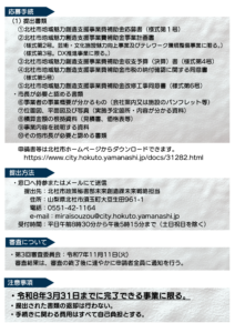 2025/09/05 / 最終更新日時 : 2025/09/05 北杜市商工会 補助金・助成金 補助金:「第3回北杜市地域魅力創造支援事業費補助金」のお知らせについて 北杜市役所政策秘書部未来創造課(42-1164)より「第3回北杜市地域魅力創造支援事業費補助金」が再募集 が始まりましたので、下記の内容をご確認の上、北杜市役所政策秘書部未来創造課へお問い合わせください。 第3回_北杜市地域魅力創造支援事業費補助金(PDF)